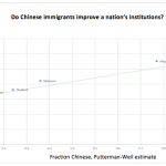 Let’s consider the case of Chinese migration throughout Asia. By the standards of European colonization, Chinese migration post-1500 has been relatively (I emphasize relatively) peaceful. The non-Chinese residents of these countries tended to have lower ancestral SAT scores than Chinese residents, so we can ask: did Asian countries with a higher percentage of Chinese-descended migrants end up economically freer? Of course, since this is a question about migration from China, China itself should be left out of the analysis. The graph below tells the story. It compares Chinese ancestry data from the Putterman-Weil global migration matrix with the Fraser Economic Freedom of the World Index for Asian countries with substantial numbers of Chinese immigrants: